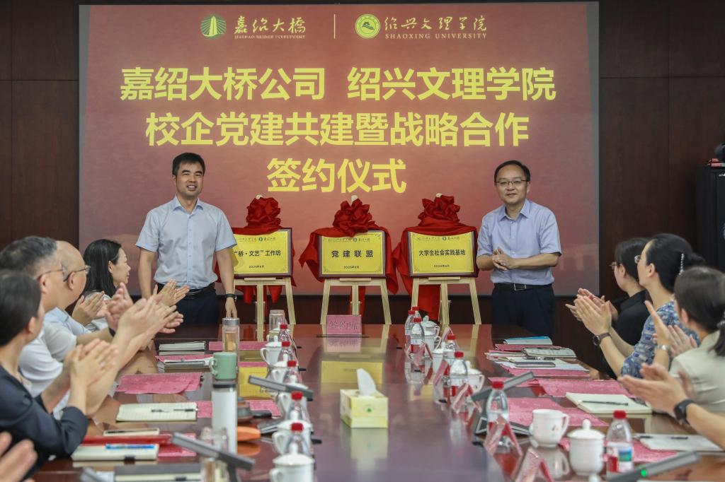 赵阳与陈富根共同为校企合作的“党建联盟”“桥·文艺”工作坊和大学生社会实践基地揭牌。
