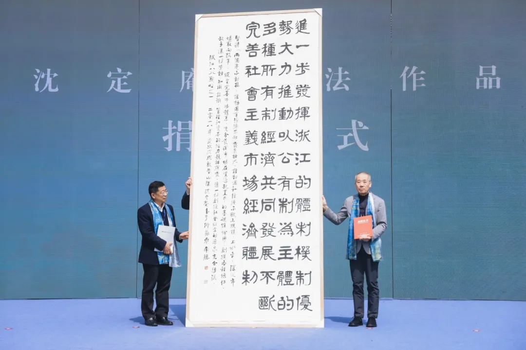 值得一提的是,作为“中国书法兰亭奖终身成就奖”获得者,沈定庵先生以往每年的书法节都会热情参会,与来自国内外的书法名家和书法爱好者交流切磋。今年,他的家属将其一批珍贵作品无偿捐赠给绍兴博物馆。绍兴博物馆馆长何鸣雷向沈定庵先生的儿子沈大晔颁发捐赠证书。