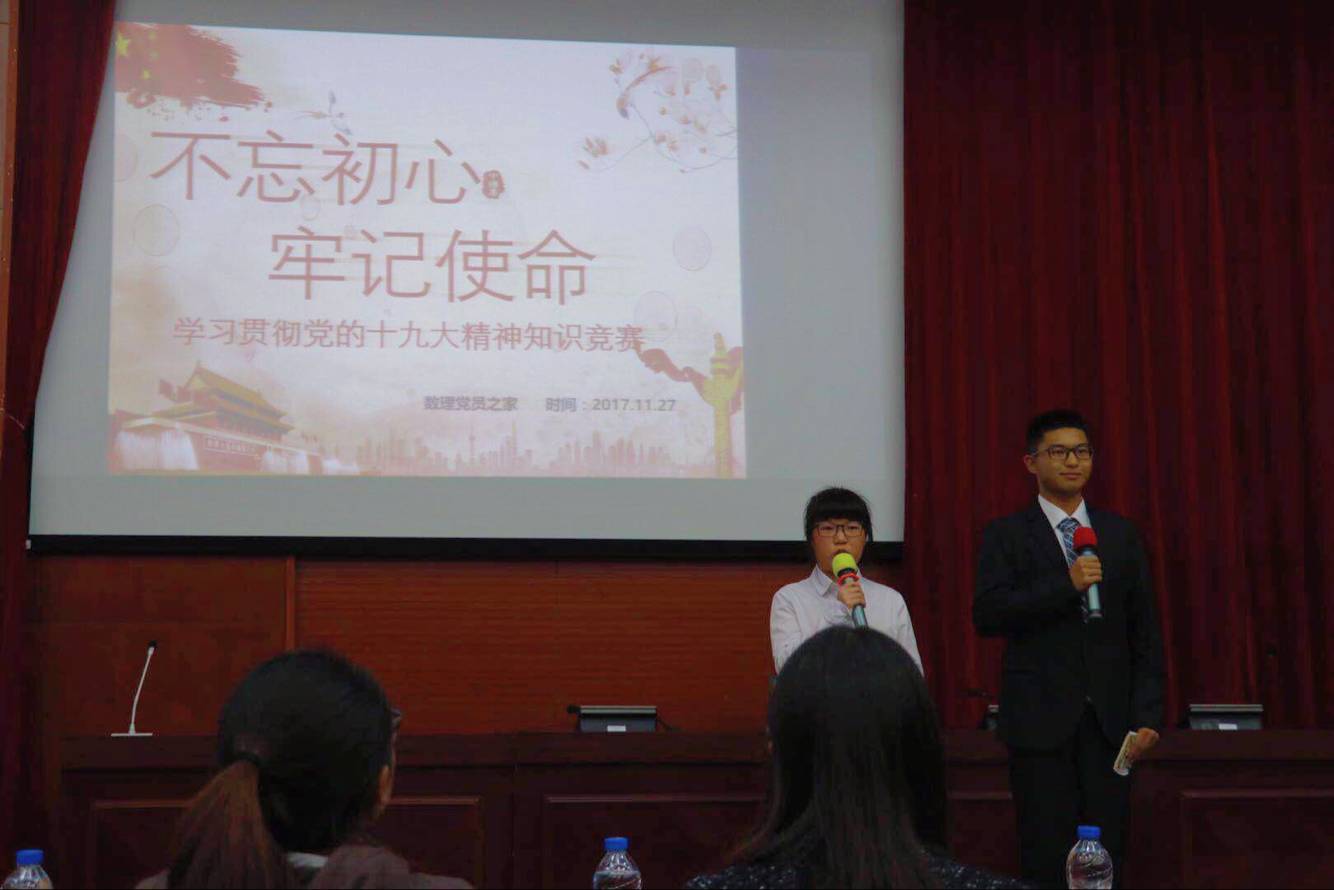 数理信息学院除了通过党委理论学习中心组、党支部大会、教职工大会等渠道开展学习,还将学习搬到了考场、移到了网络、搬进了比赛现场。近期,学院便采用现场知识竞赛和网络知识竞赛两种形式,组织举办了“不忘初心、牢记使命”学习贯彻党的十九大精神知识竞赛活动,全院师生党员、入党积极分子、入党申请人等热情参与。现场知识竞赛分笔试初赛、“九宫格”复赛、对抗决赛三个阶段开展。经过激烈的角逐,最终6支队伍进入决赛现场。
