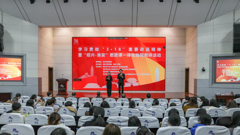 3月18日,为学习贯彻“3·18”重要讲话精神,学校联合淮阴工学院开展了“绍兴淮安”思政课一体化协同教研活动。活动于校铁城科教馆报告厅和淮阴工学院报告厅同时拉开帷幕,来自两地的思政教研员及一线教师代表共500余人线上线下齐聚,通过专题研讨、现场教学展示等形式,探索新时代思政课改革创新路径。