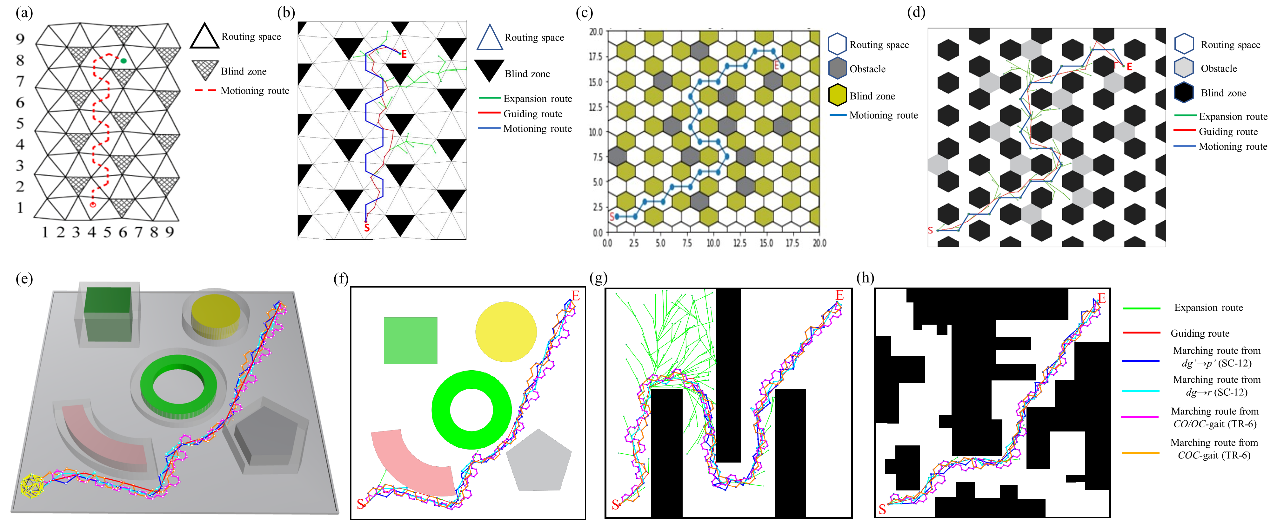 进一步地,研究团队制定了一套轨迹转向控制策略并将其嵌入至改进的快速搜索随机树(MRRT)算法用以生成最佳轨迹路线,提出了两个适用于多步态张拉整体机器人的重要引导指标,以搜索与特定需求相符的最佳步态模式,从而实现了基于目标优先级的机器人轨迹路线自适应调整。