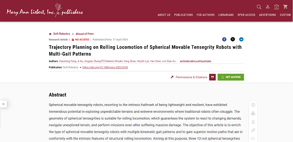 近日,土木工程学院冯晓东副教授团队与日本科研人员合作在机器人领域顶级期刊《Soft Robotics》在线刊登题为“Trajectory Planning on Rolling Locomotion of Spherical Movable Tensegrity Robots with Multi-Gait Patterns”的最新研究成果。经过大量数据分析及模拟测试,该研究首次实现了多步态球形可动张拉整体机器人在滚动运动时的轨迹规划,为此类软体机器人在复杂环境和场景中的应用提供夯实的理论依据。