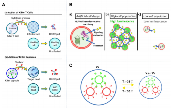 图4展示了人工细胞在模拟自然细胞行为方面的高级仿生行为,包括群体感应、捕食行为和机械化学行为。这些行为不仅体现了人工细胞在结构和功能上对自然细胞的模拟,而且揭示了人工细胞在生物医学应用中的潜力,如通过群体感应进行细胞间通信、模拟捕食行为实现特定细胞的选择性破坏以及通过机械化学行为响应外部刺激。这些研究进展表明,人工细胞技术正在向更复杂和动态的生物模拟系统发展,为未来的生物技术和医学治疗提供了新的可能性。