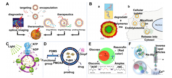 图3展示了人工细胞在不同领域的应用,包括作为纳米反应器、人工器官、治疗性纳米反应器以及合成生物学的生物反应器。这些人工细胞能够模拟自然细胞的功能,如信号传输、物质交换和能量转换,为生物医学、药物递送、组织工程和环境科学等领域提供了新的研究工具和治疗方法。