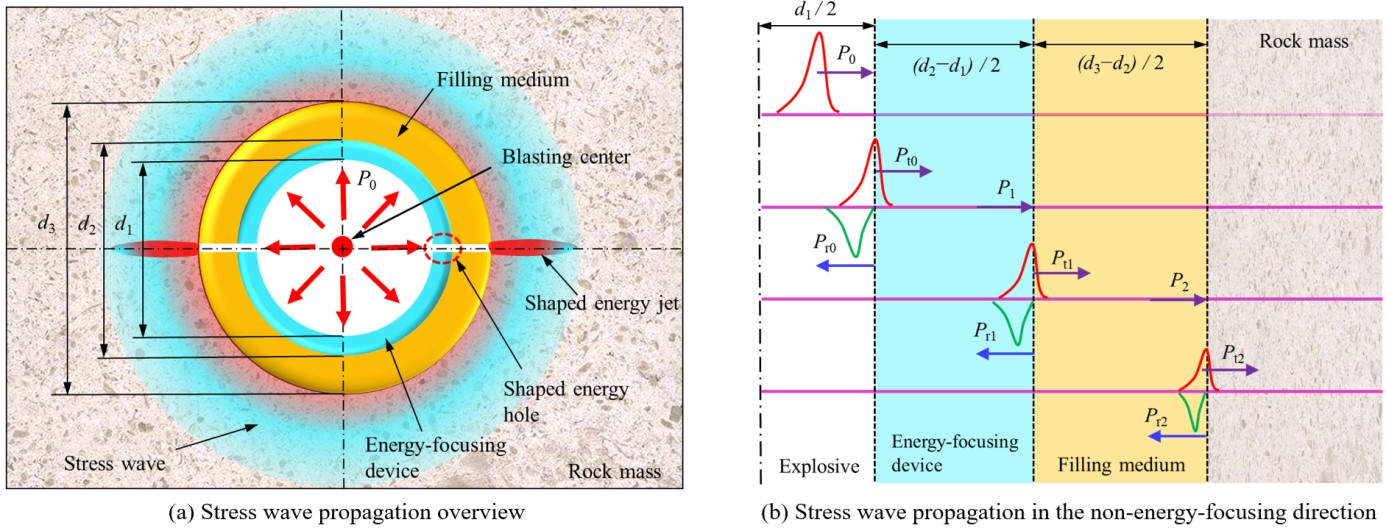该研究的核心成果在于揭示了聚能爆破能量调控机制,阐明了爆破过程中能量调控对岩石裂纹扩展的显著影响;通过数值模拟、模型实验,揭示了非聚能反向上不同充填介质条件下聚能爆破过程中应力波演化规律,发现了填充介质对聚能爆破能量调控的重要作用:填充介质的较高的波阻抗和较低的可压缩性促进了更均匀和有效的能量传播,增强了聚能方向的拉伸作用和聚能爆破的整体应力影响;同时,提出了一种评价岩石爆生裂纹粗糙度的方法,试验结果进一步表明,介质均匀性对能量聚焦爆炸效应有很大的影响,随着介质不均匀性的增加,聚能爆破过程中非聚焦方向的应力衰减被放大,导致岩石爆生裂纹的不规则性增加。